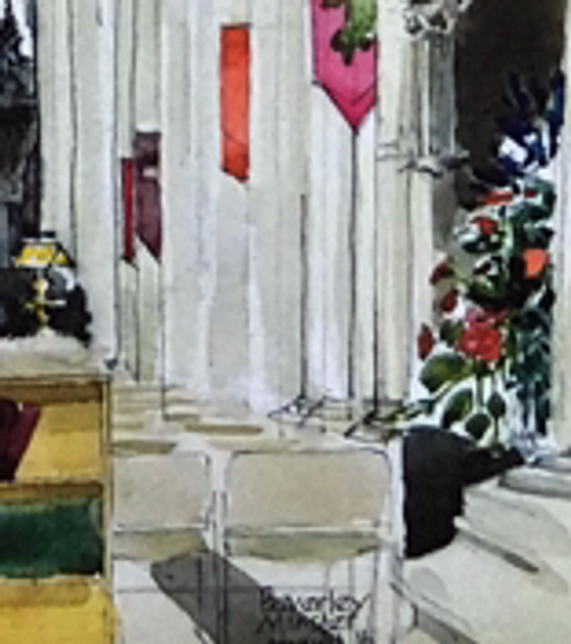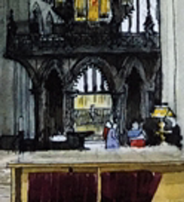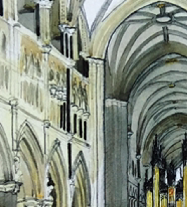 Taken from a large, 22x15 inch watercolour painting. Sketched at the Minster taking several trips to complete. It shows the beautifully presented organ in its dominant position just before the Choir stalls with their ancient misericords.
