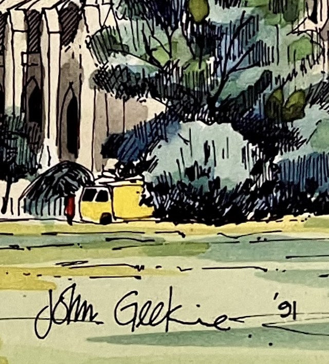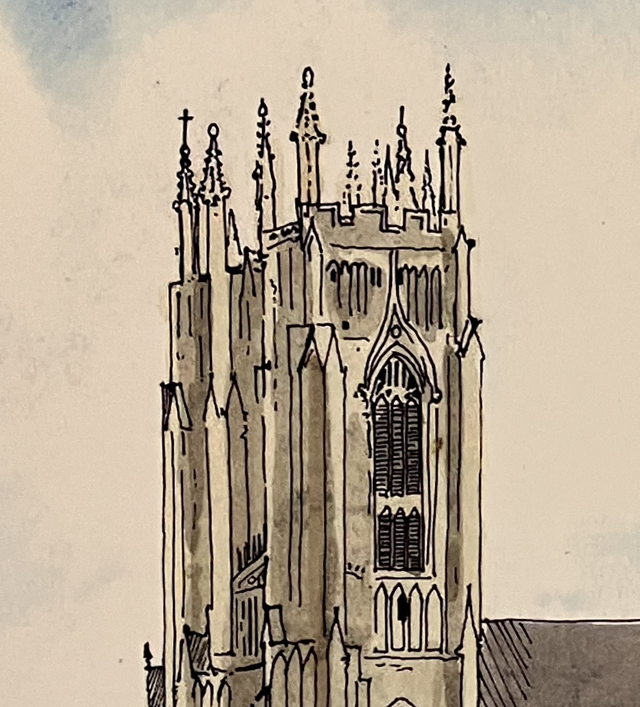 I love this print. It shows Beverley Minster across an open field, Hallgate, often used in the summer to graze cattle. A wonderful bucolic scene reminding us of a time past when the Minster was more closely linked to the farming community reinforcing its Market Town associations. This is a pen and ink sketch made at the site, I stood with an A3 piece of Bristol card, very smooth and ideal for pen and ink. Later, I added a watercolour wash. I remember the yellow van passing and quickly added it. Printed on A3 paper which will fit a standard A3 frame or, it looks good in a larger A2 frame with a suitable mount.