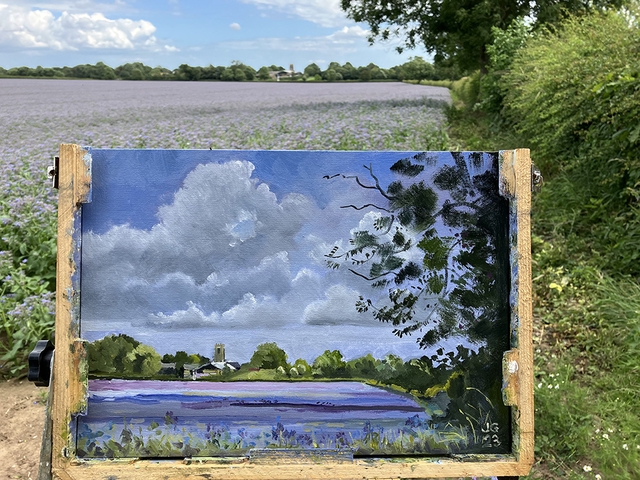 The sight of a borage field reminds me of the more transient linseed fields and to some extent distant fields of bluebells looking like rolling seas climbing the fells. Borage remains in flower longer than linseed, indeed I had seen this field about a week or so earlier, so I pulled over and parked alongside Corporation Farm, crossed the road, limboed a red metal gate to this spot, just into the field. I could see Lund Church tower and some farm buildings in the distance which would add interest. Standing at the edge of the field I was close to a large ash tree. I always try to capture ash trees in situ as they are either falling down due to ash dieback or are being felled, especially where they could cause an accident. In other words they are disappearing from the landscape. This is a 14 x 10 inch oil on canvas board painting. The colurs in the borage field varied considerably, the distant blanching reflecting the pinkish flower stems was a surprise, the darker shadows to the nearby