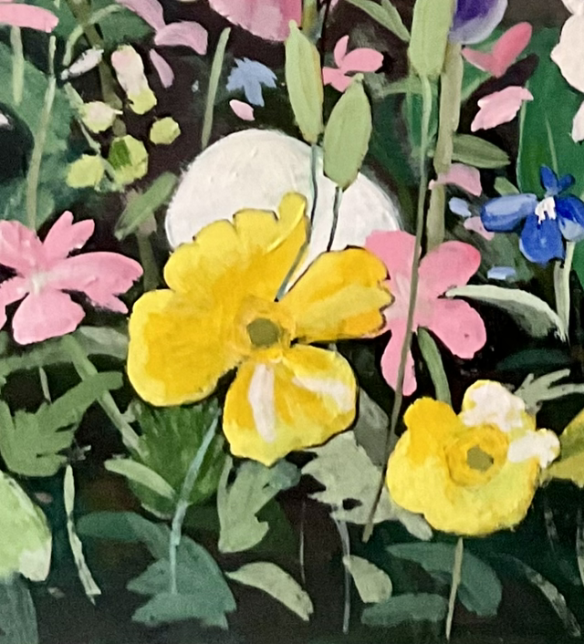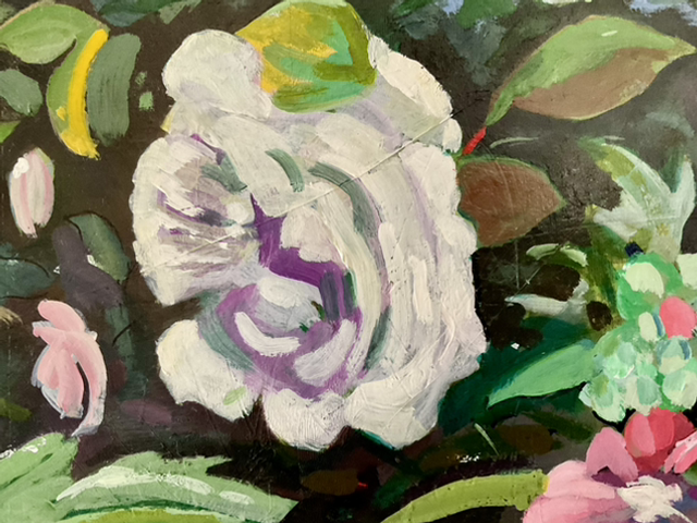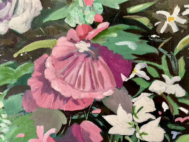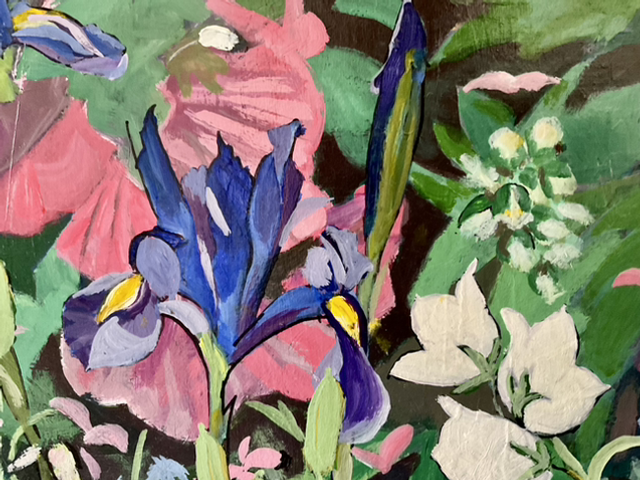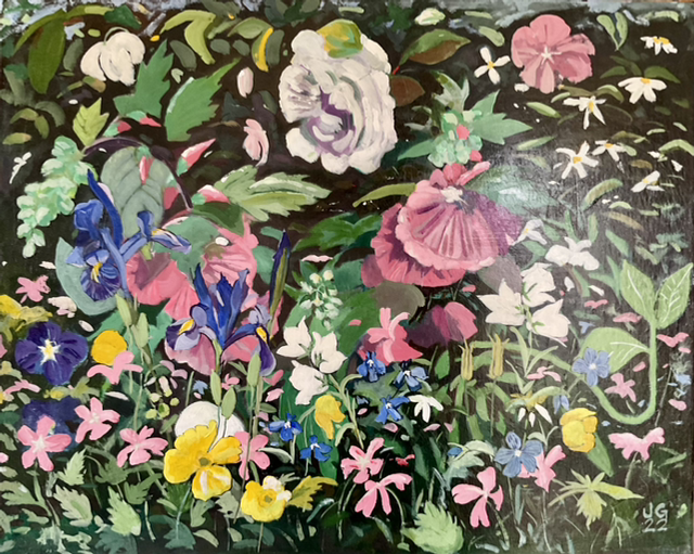 An original painting of flowers from a garden border. Large and optimistic featuring a rose and mallow with many more flowers. Will look superb on a wall. SPECIAL OFFER.