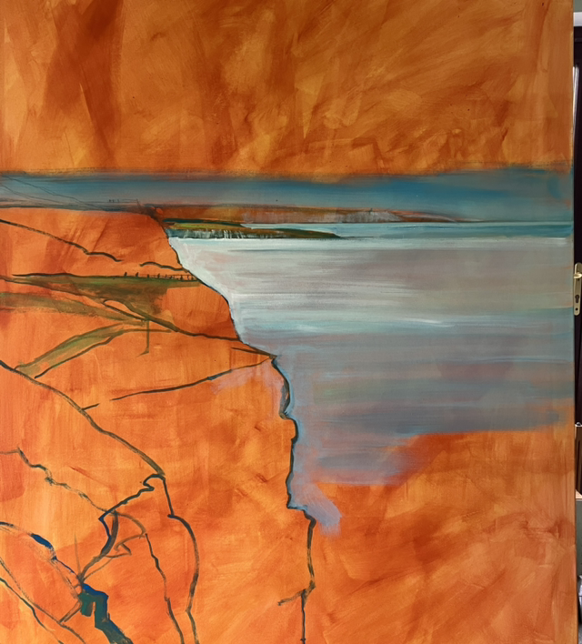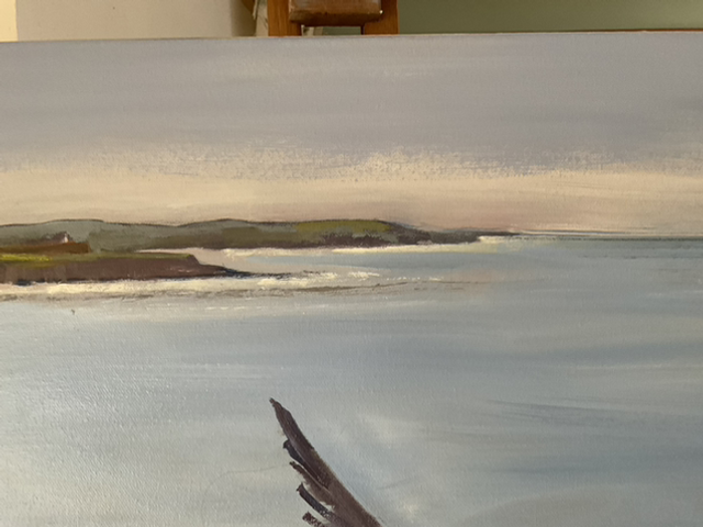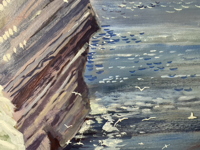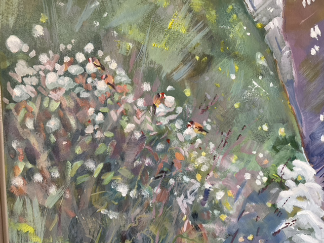 ( 150x100cm). It has been exhausting and I dare say I could continue with it, adding fine detail etc. However this painting needs to be viewed from about 5 metres away and so fine detail misses the point of the ‘impression’ of the painting. Another interesting aspect is that the eve level is high. Perhaps it should be hung at eye level and you will then find that you may get a sense of height when following the painting down to sea level. Give it a try, enlarge this and travel down the painting. You may see some goldfinches feeding on the thistle seed heads and even a porpoise in the sea, but of course this is all about gannets.