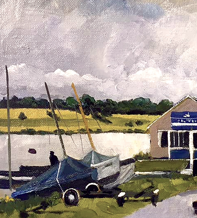 I thought, as a child that this, Hornsea Mere, was the largest freshwater lake in the UK…but now I believe it is the largest in Yorkshire. The focus here is the old boathouse which dates back to the start of the twentieth century. It is wonderfully quirky with the curved roof. Rowing boats can still be hired from it, indeed many years ago I learnt to sail there and often think about taking it up again. The original is now in the hands of the family who own (?) the boathouse. This is a print which was requested by someone who loved visiting the Mere. I sometimes help and advise a local art group nearby and the Mere with the boathouse is a place I go to afterwards to walk George.