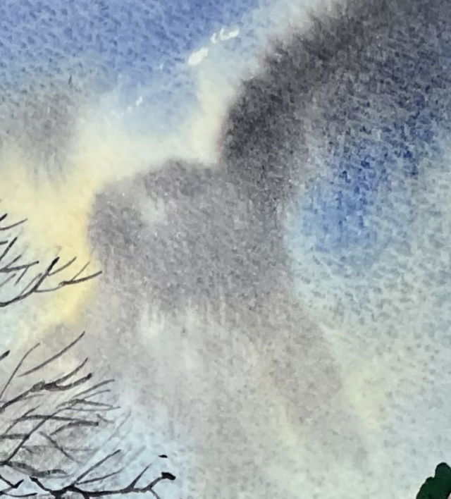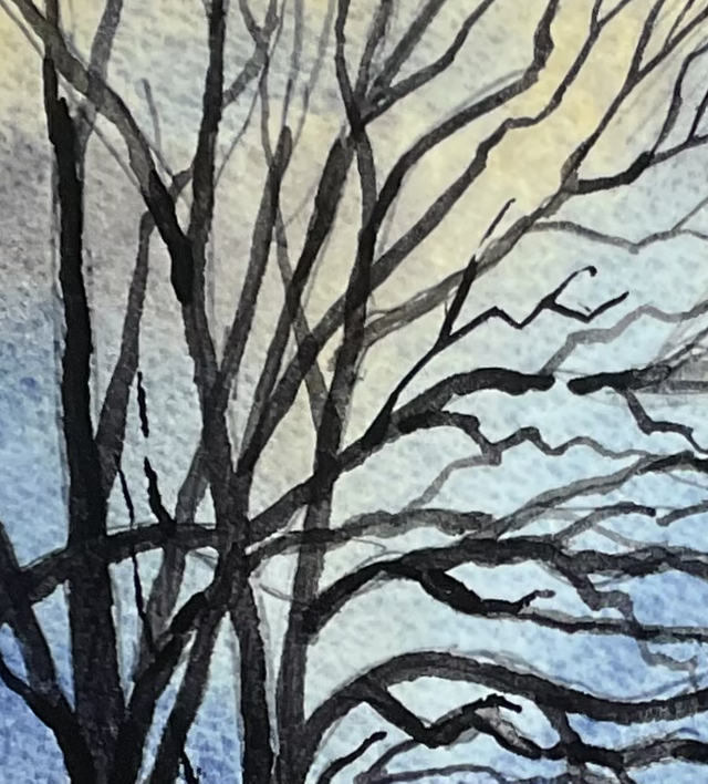 I produced this painting from a sketch made when standing near the memorial hall. It was autumn time and the road was covered in orange and brown leaves. The view towards Saint Mary’s Tower always looks interesting especially in the autumn along this road. I also wanted to include the tall tree on the corner of Champney Road.