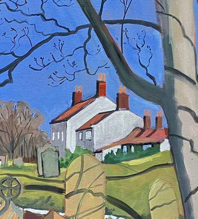 I walked George around the village of Langton and remembered a particular building I thought would make a studio. It is empty and needs some attention so I was pleased to see a little light work had been done to the ridge coping stones and brickwork. Passing the school I stopped and realised that they had broken for Easter. I like Langton very much and know some generous minded people nearby. I walked into the churchyard, found a view and set up my French easel and folding table. I had a large 1m x 0.5m canvas and large, long handle brushes. I set out the painting and completed about 90% using just the primary colours. George lay in the deep shade behind me, asleep. I packed up and returned home. The next day I added some fine details.