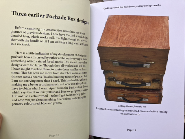This is a book for artists. It shows how to make a painting box, (pochade box) which will include everything they need to paint outside. The book is detailed, explaining every facet involved in making these boxes. The artist has used painting boxes for some time and has refined his design over the years. You can benefit from his experience and knowledge to make your own painting box. These boxes are known as pochade boxes a French term meaning painting in the open air. They allow for painting at the scene, wet on wet, to complete a painting, as such the artist can create a painting ALLA PRIMA. Painting plein air is a term which meaning a painting, although painted outside, can be refined back at the studio. Alla Prima paintings are completed in the one sitting. Though these painting boxes are designed to paint outside, in the fresh air, there can be used inside at home or in the studio. The book is a comprehensive guide and includes examples of paintings with notes made on the day.