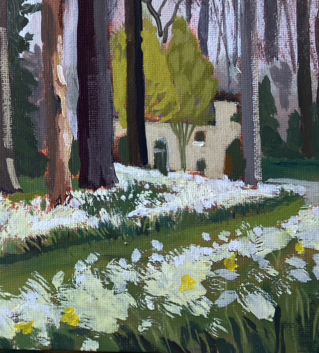 After recently making a sketch a return trip needed making, quickly before the SUMPTIOUS, superb daffodils pass over. Today is Easter Saturday. My main aspect with this painting is to capture the essence of the mass planting. It is as if one approaches the church riding on a cloud. All this is the generous hard work of Settrington House which can just be glimpsed through the trees. The approach road is narrow, straight and well maintained verges full of narcissi at this time. I could see signs of anemones and possibly snowdrops though all their flowers have now disappeared. Among the pale cream, even white petals of the pheasants eye, flashes of yellow indicated the odd traditional daffodil.