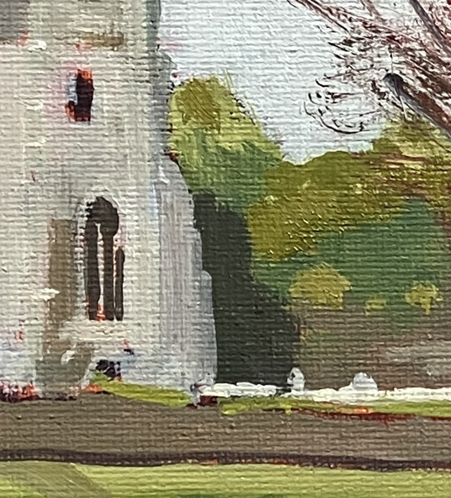Settrington Church with daffodil approach. 14x10” oil on canvas board.