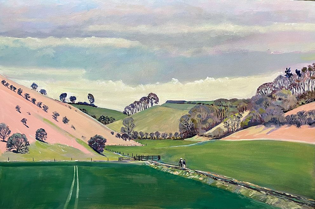A large, 36x24 inch oil on canvas from March 2023. This painting shows the spring time with emerging dark green crops, the tree are still bare but about to spring into life. The hillsides are covered in dead grass with little green yet showing. In the distance sheep can just be seen, soon , as the weather improves we will see more sheep out covering the hillsides. This painting was started late in the afternoon and I have used my limited palette of just the three primary colours plus white.