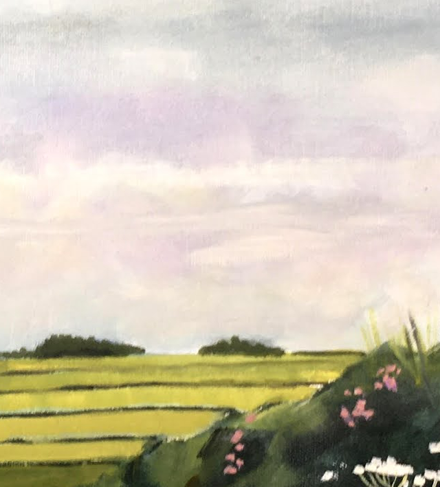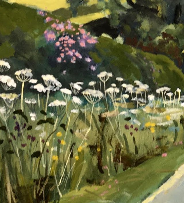 This painting has been made looking down towards WARTER village from the LOANINGDALE Junction. I wanted to feature the Ash tree and the rolling hills in the far distance. This is a special road which will be familiar to many people. It is a joy to drive down into the village. The grass verge is are colourful at this time of year full of wildflowers. The distant Hills speak of golden crops. This is a large painting made with a French easel at the location.